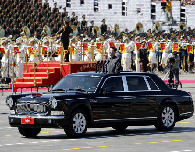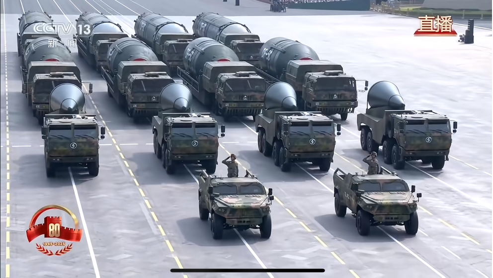 当国之重器东风导弹方队缓缓驶过眼前,DF-61、DF-5C等最新可覆盖全球的三位一体洲际战略核导弹的现身使得全网开始沸腾,解说员评价为“覆盖全球、全时戒备、有效威慑、以武止戈、砥定乾坤”。