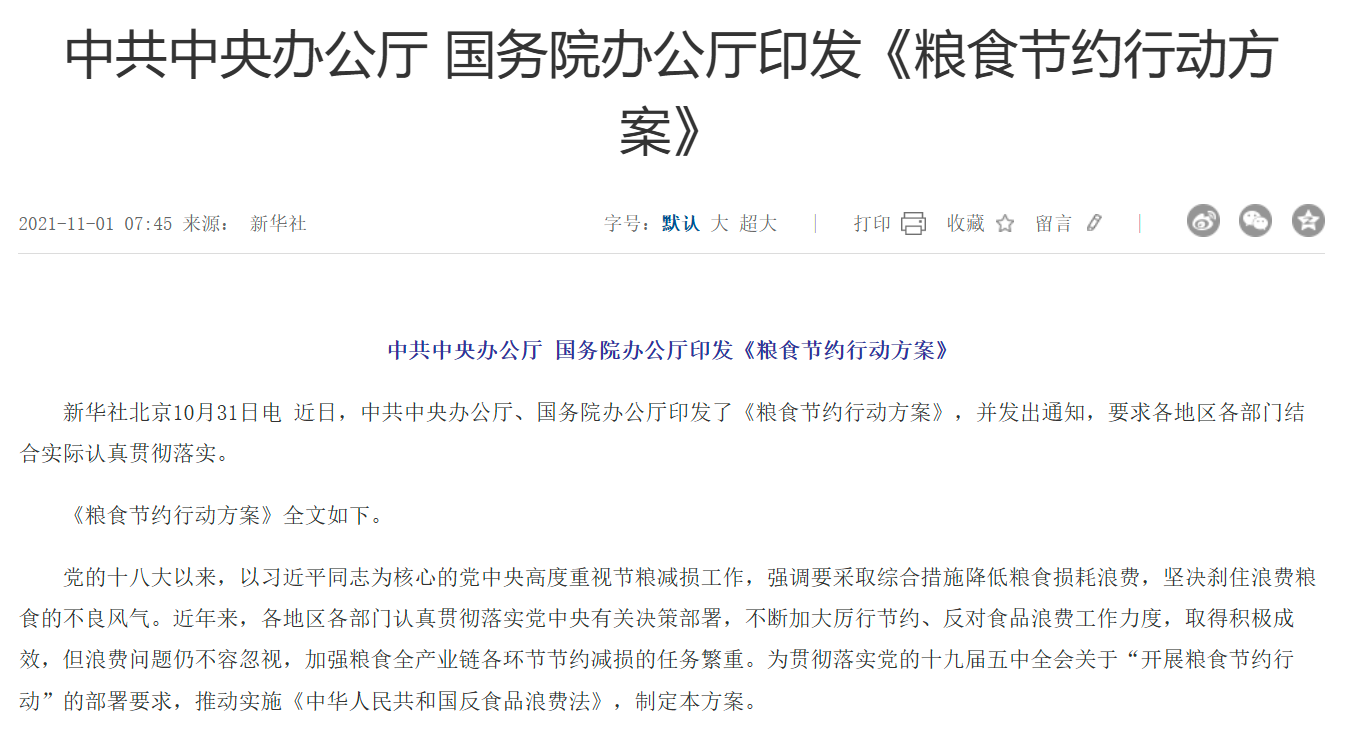 2021年11月,中共中央办公厅 国务院办公厅印发《粮食节约行动方案》指出:“有效利用米糠、麸皮、胚芽、油料粕、薯渣薯液等粮油加工副产物,生产食用产品、功能物质及工业制品。”明确将米糠列为粮食资源,强调要加以综合利用。